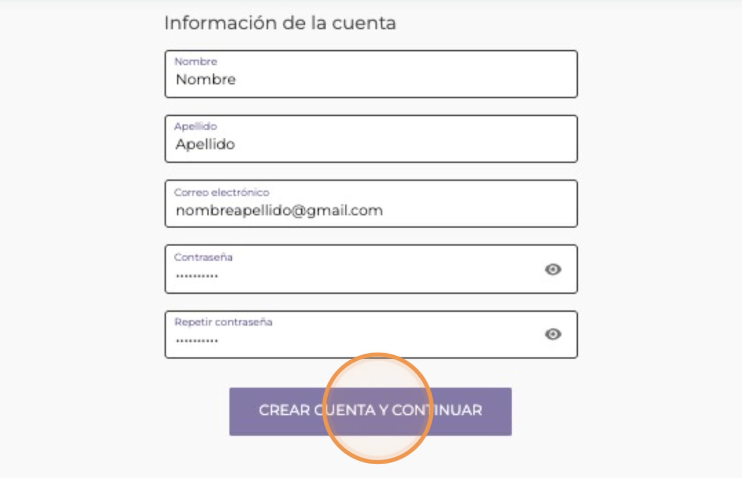 7. Llena los siguientes datos y haz "Click"en "CREAR CUENTA Y CONTINUAR"