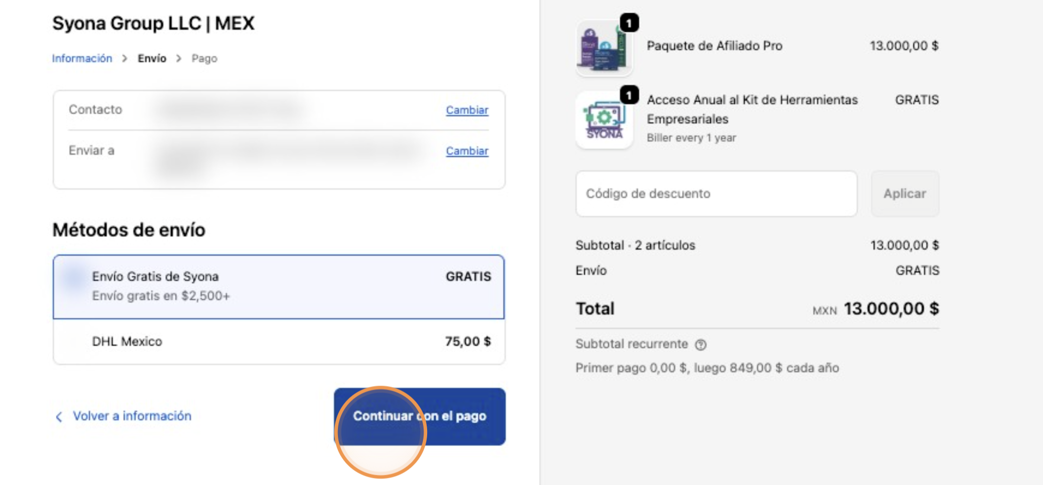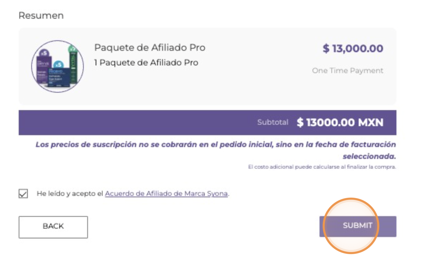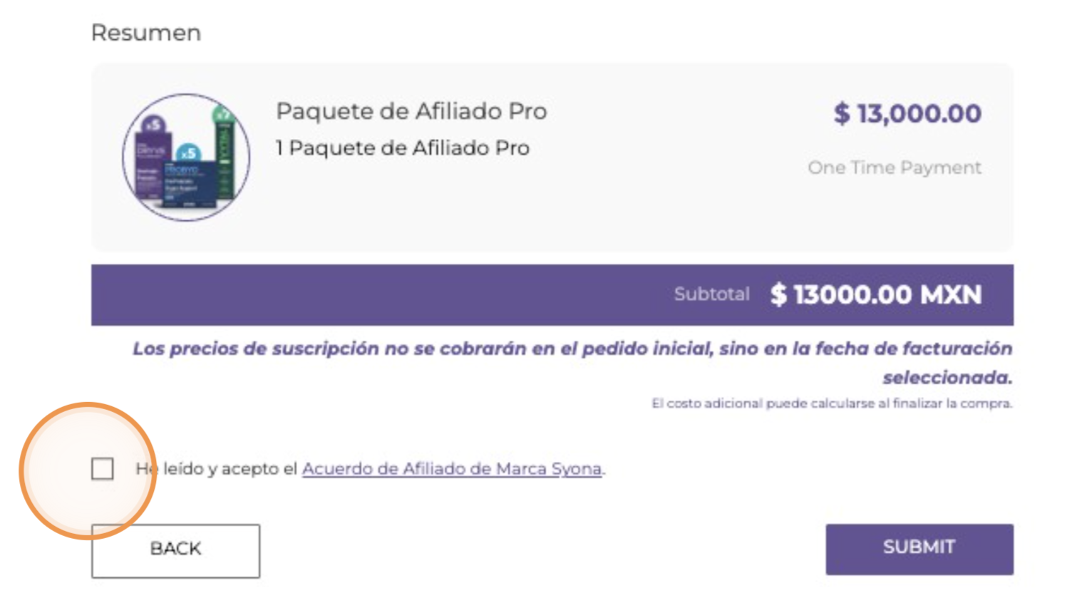 17. Revisa tu información personal y el resumen de tu pedido. Una vez verifiques que la información es correcta, lee y acepta el Acuerdo de Afiliado de Marca de Syona.