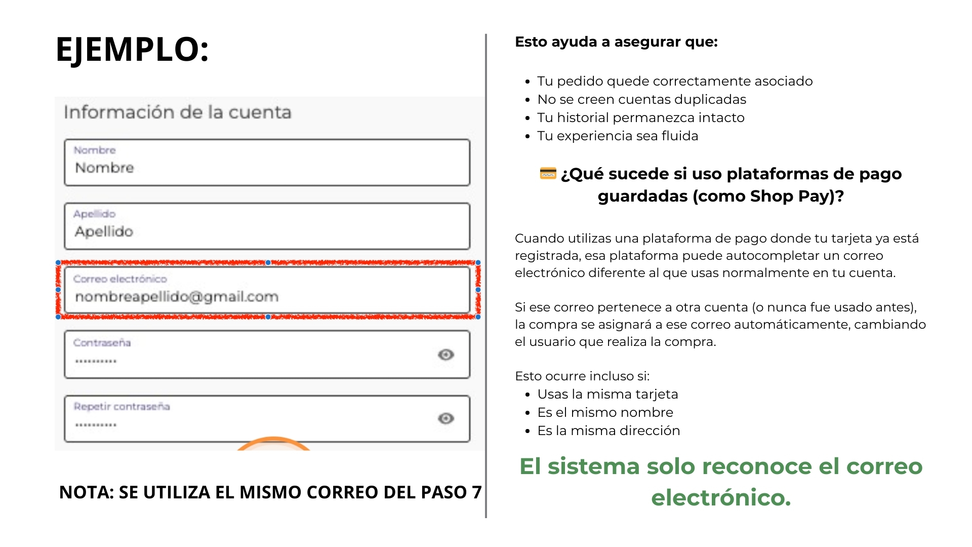 Si necesitas más información, puedes ir al siguiente artículo: ¿Por qué es importante usar el mismo correo electrónico durante el checkout?
