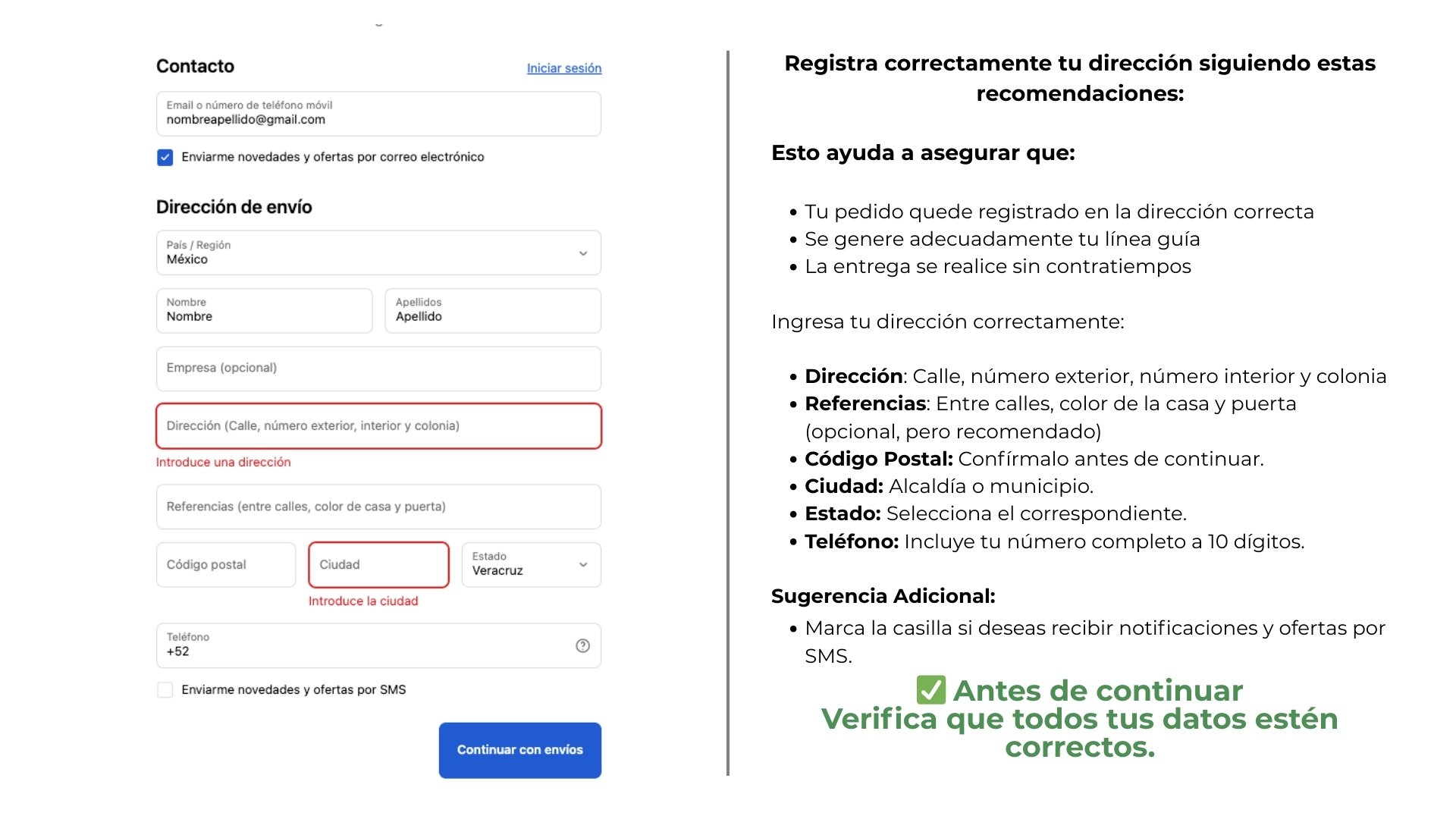 Después, llena tu información domiciliaria y haz "Click" en "continuar con envíos".